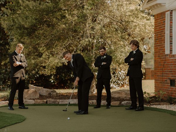 With a front row seat of the North Georgia mountains, our Groom’s Den is designed for relaxation, camaraderie, and a little pre-wedding fun. Complete with a putting green, lounge seating and entertainment, it’s a favorite hangout for the groom and his groomsmen. Here, laughter echoes, stories unfold, and the celebration begins long before the ceremony starts.